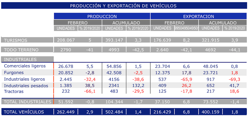 Respecto a los industriales pesados, en febrero se han exportado un 26,2% anual más, con 409 unidades, y en cuanto a las tractoras, en el mes se han exportado 125, un 17,8% menos que en idéntico mes de 2019.