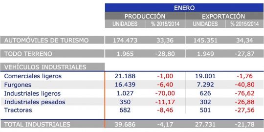 En cuanto a la exportación de vehículos, el año empieza con un incremento del 19,6% y 175.031 unidades. El ratio de producción sobre exportación comienza el ejercicio con un 81%, es decir, cinco puntos menos que en 2014, lo que supone que el conjunto de las factorías españolas se encuentran más cerca del equilibrio entre producción y exportación, debido al impacto en el mercado interior del Plan PIVE.