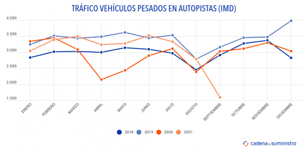 En este mismo sentido, el pasado mes de septiembre se registró en las carreteras de pago del país un total de 68 millones de vehículos pesados kilómetro, un 60,47% menos que en idéntico mes de 2020.