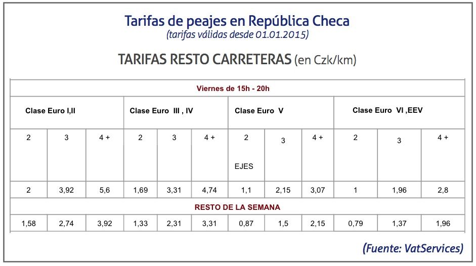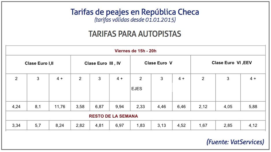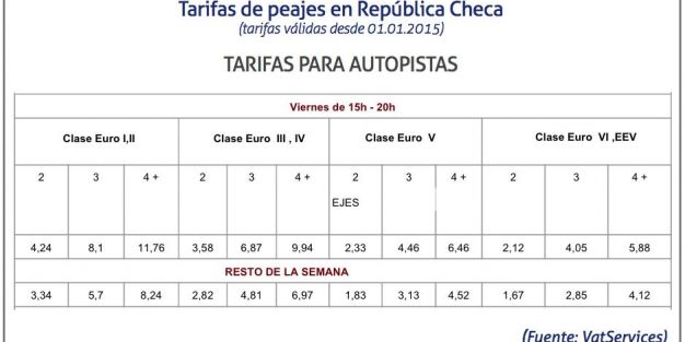 A partir del 1 de enero de 2015, se incrementarán las tarifas de peajes para los vehículos de más de 3,5 toneladas en la República Checa, tal y como ha informado VatServices. En concreto, el Ministerio de Transportes checo aprobó en octubre el incremento del 8,2% de las tasas para los camiones Euro 1-4 y del 9,8% para los Euro 5.