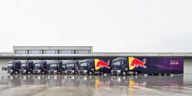 Siete camiones Renault Trucks T 520 High acompañan a Red Bull por Europa en la categoría reina del automovilismo, para trasladar la 'Tree House', la recta de boxes alargada, del equipo de Fórmula 1 Infiniti de Red Bull de un gran premio a otro.
