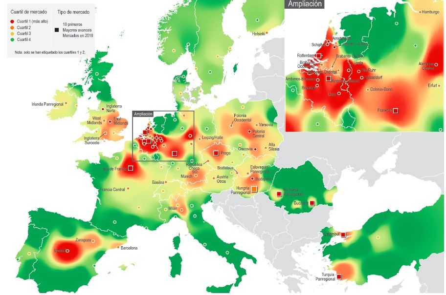 Tras los tres primeros lugares, copados por ubicaciones del Benelux, se sitúa la región alemana de Rhin-Ruhr en cuarta posición, mientras que Madrid, escala hasta la quinta posición, desde el séptimo puesto que ocupaba en la anterior encuesta realizada hace cinco años.