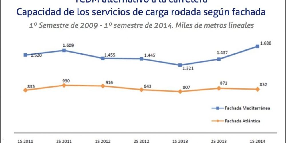 Entre los aspectos más destacables entre ambos periodos, cabe destacar el aumento de la oferta en los servicios de TMCD alternativos a la carretera a través del incremento de la capacidad en la carga rodada, un 5,6% en la fachada atlántica y un 27% en la mediterránea.