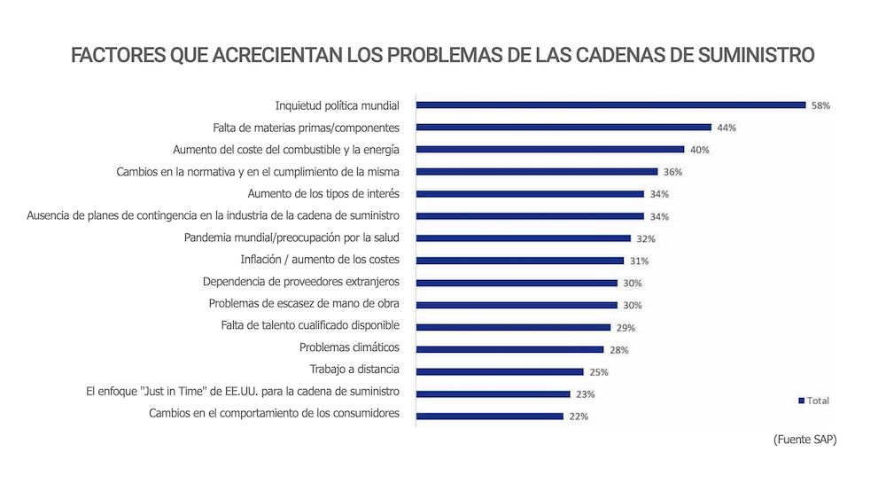 Los principales factores señalados son la inestabilidad política mundial (58%), la falta de materias primas (44%) y el aumento de los costes de combustible y energía (40%). Solo el 31% citó la inflación como una causa importante.