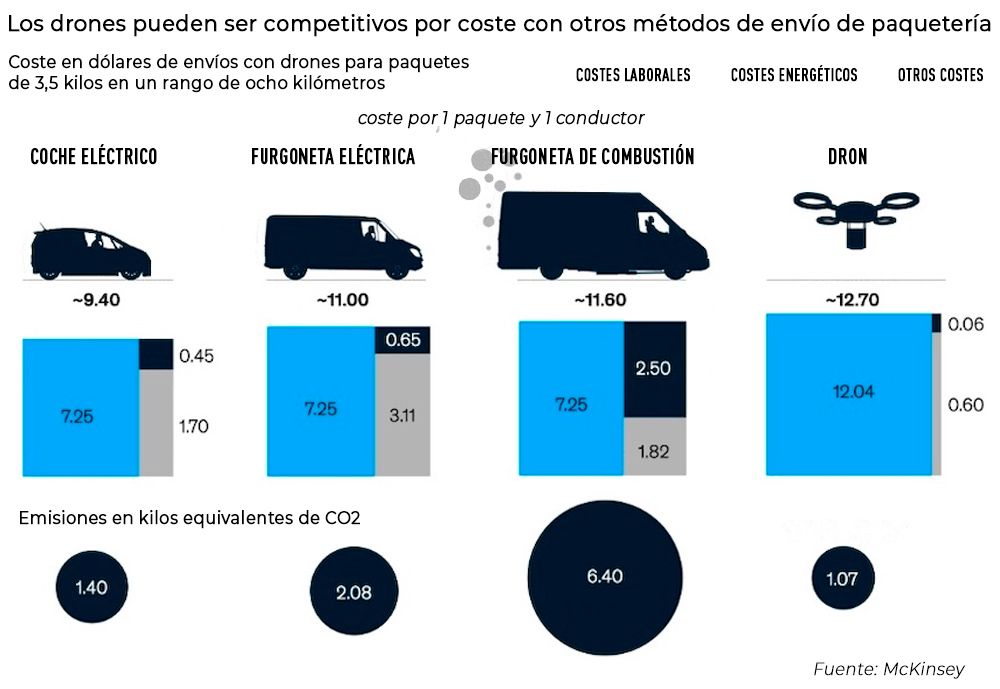 Por ello, McKinsey aboga por la automatización del control de vuelo de estos drones, así como por el avance en paralelo de la regulación para que esta operativa pueda convertirse en una alternativa a los métodos actuales de entregas de paquetería por coste.