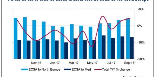 Los volúmenes movidos entre la costa este de Sudamérica y Europa, en ambos sentidos, finalizarán 2017 en niveles similares, como ya ocurrió en el año 2012. A esto se añade que Brasil está intentando impulsar sus exportaciones de fruta, que han repuntado un 4% hasta septiembre.