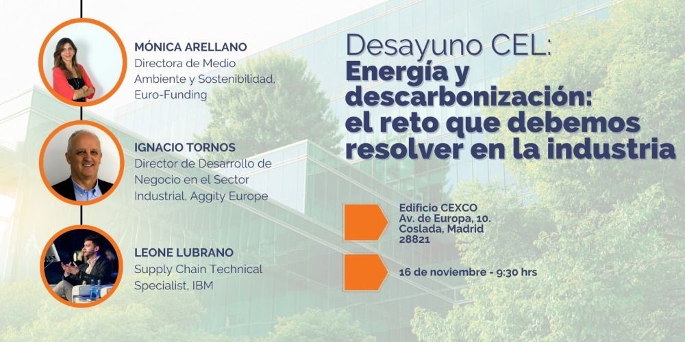 Dicho evento, titulado "Desayuno Cel – Energía y descarbonización: el reto que debemos resolver en la industria", arrancará a las nueve y media de la mañana con la presentación sobre el marco de la descarbonización, que aborda los objetivos para 2030 y 2050, así como temas de financiación y ayudas, a cargo de Mónica Arellano Villanueva, directora de medio ambiente y sostenibilidad en Euro-Funding.