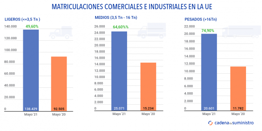 Las matriculaciones de vehículos comerciales e industriales en la Unión Europea han aumentado un 51,3% en mayo de 2021 hasta las 165.363 unidades, por el efecto comparativo con el mismo mes de 2020, en plena crisis sanitaria del Covid-19.