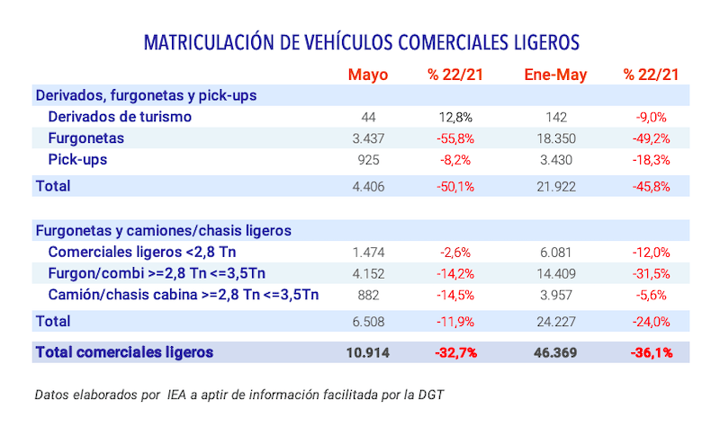 Desde que empezó el año, se han matriculado 46.269 vehículos comerciales, un 36,1% menos, de los cuales 21.922 unidades corresponden a derivados, furgonetas y pick-ups, lo que supone un descenso del 45,8%.