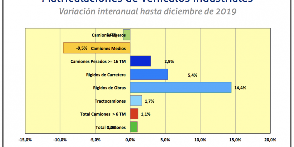 En el año 2019, las matriculaciones de vehículos industriales han aumentado un 1% hasta las 24.957 unidades, según los datos registrados por Aniacam. Por segmentos, los camiones ligeros han retrocedido un 1% hasta las 1.092 unidades, destacando Mercedes con 427 matriculaciones que suponen un 39,10% de cuota de mercado.