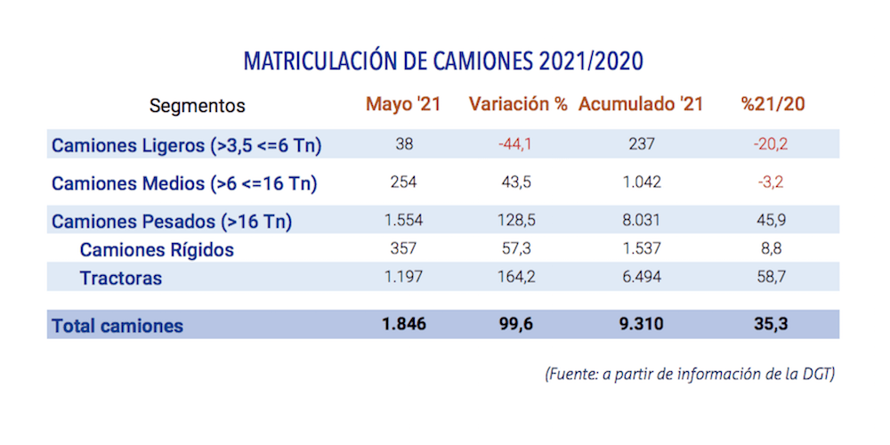 En cuanto a los vehículos pesados de más de 16 toneladas, las matriculaciones se encuentran un 128,5% por encima de las del quinto mes de 2020, con 1.554 unidades, aunque continúan un 12,1% por debajo de las de 2019.