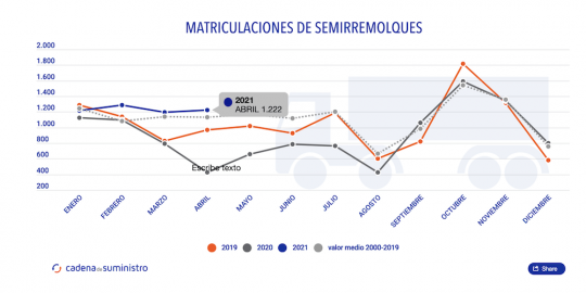 Según los datos facilitados por la Asociación de Fabricantes de Remolques y Semirremolques Asfares, la matriculación de remolques y semirremolques de más de 12 toneladas en abril de 2021 ha sido de 1.222 unidades.