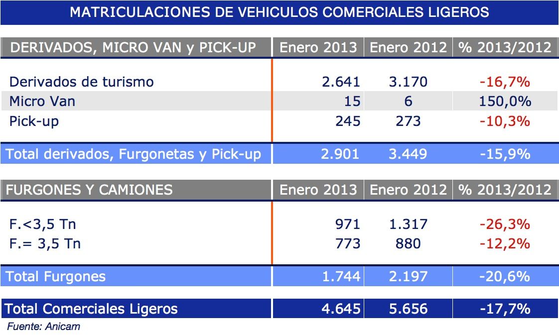 Las pick-up han retrocedido un 10,3% con 254 vehículos matriculados y los derivados de turismo registran la caída más acusada con 2.641 unidades, lo que supone 16,7% menos que en enero de 2012.