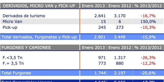 Una vez más el mercado de vehículos comerciales registra una importante caída durante el mes de enero. A excepción del segmento de las furgonetas, todos los sectores ha descendido una media de 17,7% y los furgones han retrocedido más del 20%. Las cifras de enero, como las de los últimos 60 meses precedentes, bajan hasta representar un volumen de mercado mínimo, con poco más de 4.600 vehículos matriculados.