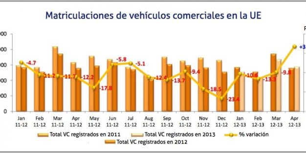 Las matriculaciones de vehículos comerciales en el mes de abril crecieron un 3,6% respecto al mismo periodo del 2012. Por primera vez desde diciembre de 2011 este tipo de matriculaciones registra un resultado al alza, principalmente sostenido por la demanda de nuevas furgonetas que ha aumentado un 5,8%. En cifras absolutas, el número total de registros fue de unas 100.000 unidades por debajo del nivel anterior a la crisis registrada en abril de 2008.
