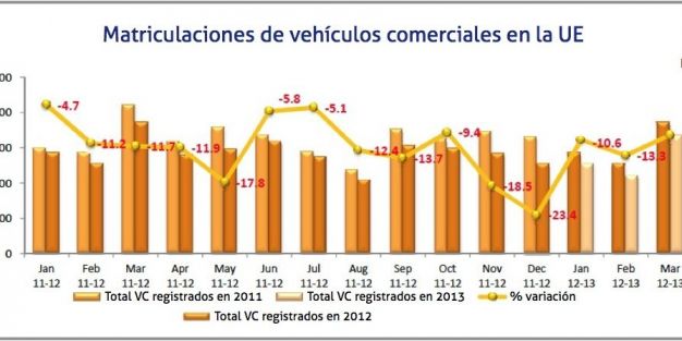 En marzo, las matriculaciones de vehículos comerciales en la Unión Europea siguen manteniendo la tendencia a la baja que ha prevalecido a lo largo de 2012, con lo que ya suma el décimo quinto mes de caídas consecutivas. Con un total de 166,402 unidades, la demanda de vehículos en marzo ha experimentado un descenso de 9,8%.
