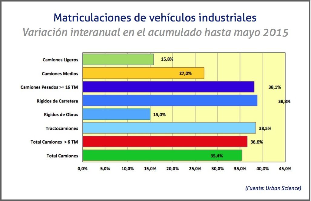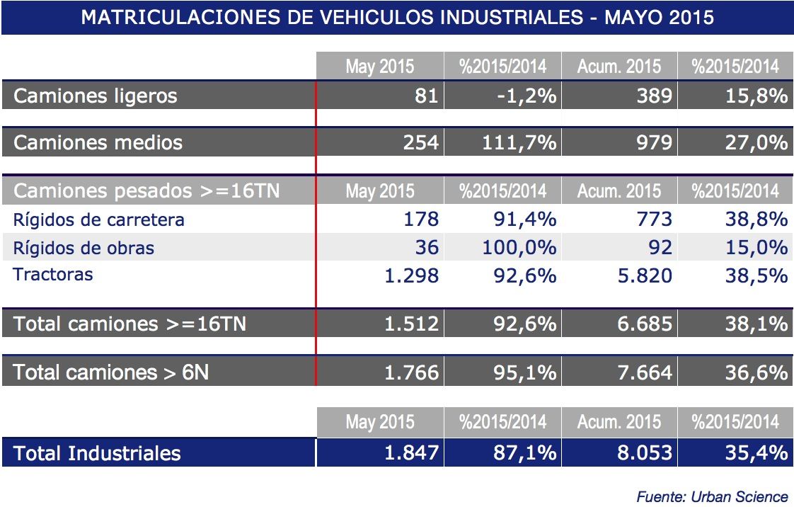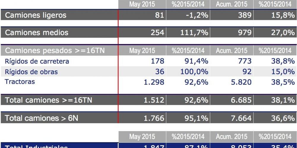 El mercado de vehículos industriales en mayo ha registrado un aumento del 87,1% en comparación con mayo de 2014. Excepto los camiones ligeros, todos los segmentos han registrado crecimiento, en especial los rígidos de obra, con un 100,0% más, y los camiones medios, con un 111,7% más.
