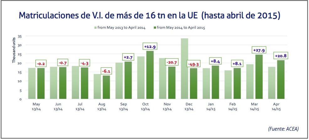 Las matriculaciones de vehículos industriales y autobuses en el mercado europeo se han situado en 671.701 de unidades durante los cuatro primeros meses del 2015, lo que supone una subida del 13,0%, según datos de la Asociación de Constructores Europeos de Automóviles, Acea. España (+35,2%), Reino Unido (+23,9%), Italia (+7,6%), y Alemania (+7,1%) han visto incrementarse el número de matriculaciones, mientras que Francia (+0,1%) se mantiene estable.