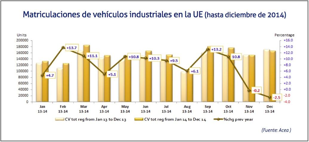 Las matriculaciones de vehículos industriales y autobuses en el mercado europeo se han situado en 1.849 millones de unidades durante el 2014, lo que supone una subida del 7,6%, según datos de la Asociación de Constructores Europeos de Automóviles, Acea. España (+31,6), Italia (+13,9%), el Reino Unido (+10,8%) y Alemania (+4,8%) han visto incrementarse el número de matriculaciones, mientras que Francia (-0,4%) se ha mantenido estable.