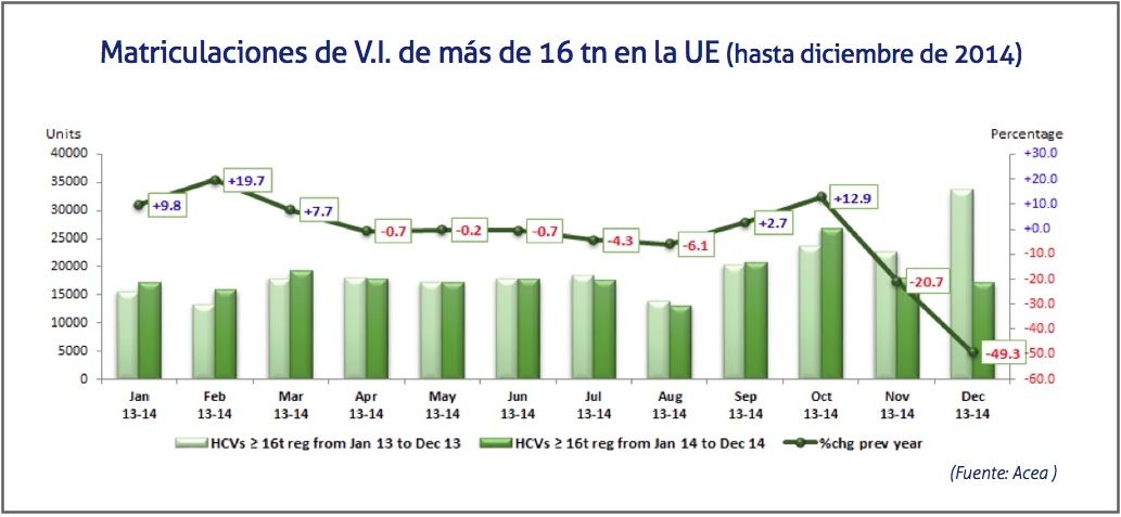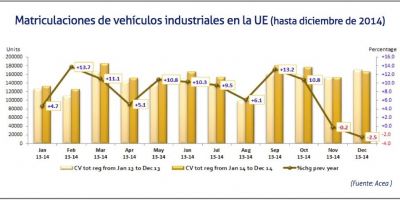 De enero a diciembre, se han registrado 280.391 unidades en la Unión Europa, un 8,1% menos que en el mismo período de 2013. Italia (+0,0%) y España (+23,2%) han sido los países que más han crecido o mantenido, mientras que las matriculaciones de camiones en Alemania (-0,9%), Francia (-13,7%) y en el Reino Unido (-27,8%) han descendido.