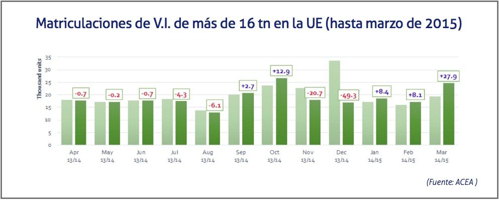 Las matriculaciones de vehículos industriales y autobuses en el mercado europeo se han situado en 502.210 de unidades durante los tres primeros meses del 2015, lo que supone una subida del 13,3%, según datos de la Asociación de Constructores Europeos de Automóviles, Acea. España (+42,3), Reino Unido (+24,2%), Alemania (+7,1%), e Italia (+7,0%) han visto incrementarse el número de matriculaciones, mientras que Francia (-0,5%) sigue registrando caídas.