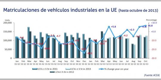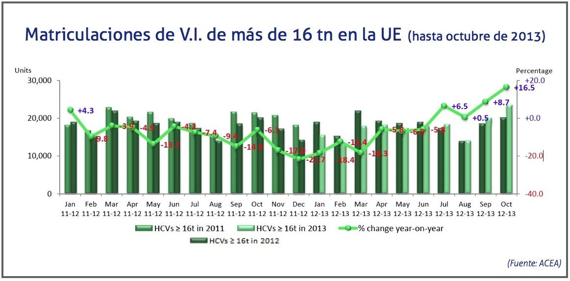 Las matriculaciones de los vehículos industriales pesados llegó a las 23.519 unidades en octubre, es decir, un 16,5% más que en el mismo mes de 2012. Alemania (+3,1%), España (+5,9%), Francia (+10,5%) y el Reino Unido (+36,2%) contribuyeron positivamente al crecimiento.