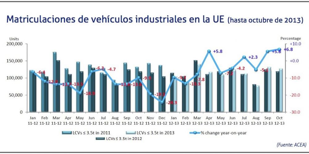 En octubre, el segmento de las furgonetas en la UE se ha visto un incremento del +6,8% , con un crecimiento en los mercados de un +1,7% en Alemania, un +3,6% en Francia, un +26,3% en Reino Unido y un +31,8% en España. Italia es el único país en donde desciende, (-14,3%). Un total de 126.632 nuevas furgonetas se han registrado en la UE en este mes.