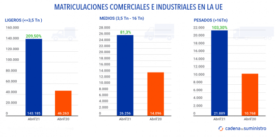 Las matriculaciones de vehículos comerciales e industriales en la Unión Europea han aumentado un 179,2% en abril de 2021 hasta las 171.283 unidades, por el efecto comparativo con el mismo mes de 2020, cuando se declaró la pandemia del Covid-19 y las ventas alcanzaron un nivel extremadamente bajo.