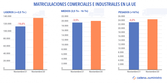 En lo que respecta a los vehículos industriales de más de 16 toneladas, las matriculaciones se han reducido un 3,5% en noviembre, a pesar de los buenos datos obtenidos en Europa central, con un crecimiento del 13,4%.