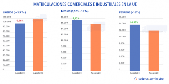 En el segmento de los vehículos industriales de más de 3,5 toneladas, las entregas aumentaron un 10,6% en julio y un 9,1% en agosto, principalmente por el incremento del 42,7% de Europa Central. En cambio, entre los principales mercados, solamente ha anotado un buen dato Alemania, con un 4,6% de matriculaciones.