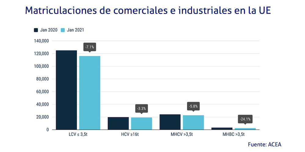 Las matriculaciones de vehículos comerciales e industriales en la Unión Europea han descendido un 7,2% en enero de 2021 por los efectos de la crisis sanitaria, con un total de 141.462 unidades, según los datos de la Asociación Europea de Fabricantes de Automóviles, Acea.
