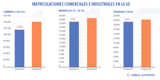 Las matriculaciones de vehículos comerciales e industriales en la Unión Europea han retrocedido un 16,4% en octubre, manteniendo así su trayectoria a la baja, según los datos de la Asociación Europea de Fabricantes de Automóviles, Acea.