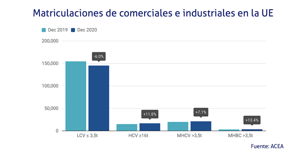 En el mes de diciembre, se han matriculado 170.122 comerciales e industriales, que suponen una caída del 4,2%, debido al retroceso de las furgonetas, que suponen el 85% de las entregas. En Alemania y España, las ventas han aumentado un 4,7% y un 2,3% respectivamente, mientras que en Italia y Francia, se han reducido en un 9,4% y un 2,1%.