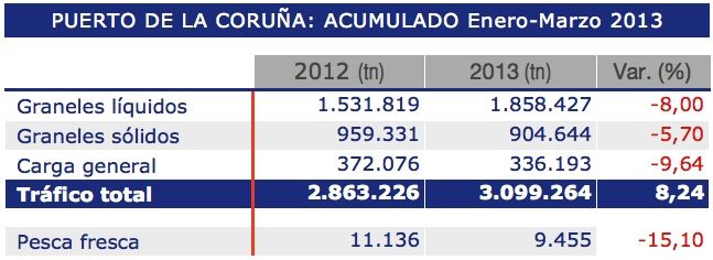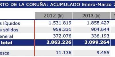 El balance del primer trimestre de 2013 en el tráfico de mercancías del puerto de La Coruña mantiene su saldo positivo, con un crecimiento del 8,24%, al haber registrado un total de 3.099.264 toneladas sumando graneles líquidos y sólidos y mercancía general.
