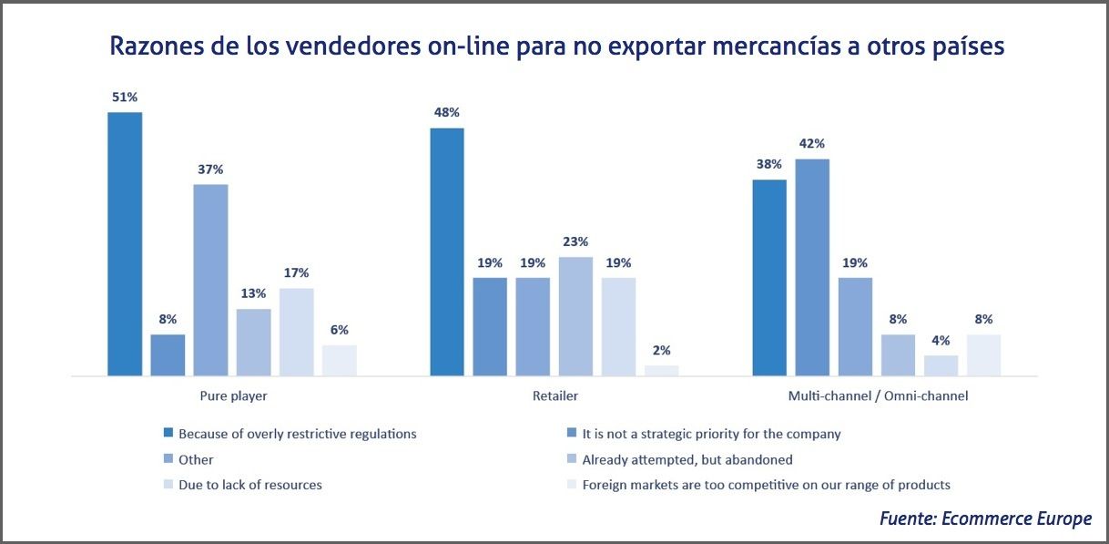 Entre las razones para no realizar envíos transfronterizos, el 51% de los pure player, el 48% de los retailers y el 38% de los 'omni-channel' han señalado las regulaciones excesivamente restrictivas.