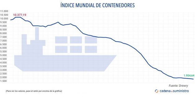 El Índice Mundial de Contenedores elaborado por Drewry, que evalúa las tasas de carga de contenedores en las ocho rutas principales hacia y desde Estados Unidos, Europa y Asia, se ha reducido en un 2% en la última semana, con 1.954,64 dólares/FEU (1.836 euros).