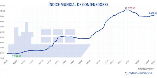 El Índice Mundial de Contenedores elaborado por Drewry, que evalúa las tasas de carga de contenedores en las ocho rutas principales hacia y desde Estados Unidos, Europa y Asia, se ha incrementado en un 1,1% en la primera semana de enero, con 9.408,81 dólares/FEU (8.316 euros), si bien esta cifra representa un incremento del 80% en relación al mismo periodo de 2021.