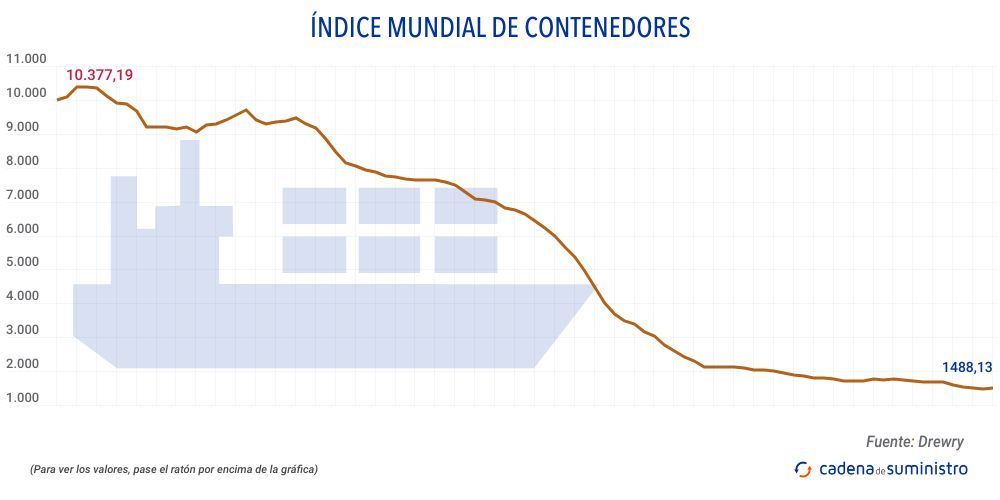 El Índice Mundial de Contenedores elaborado por Drewry, que evalúa las tasas de carga de contenedores en las ocho rutas principales hacia y desde Estados Unidos, Europa y Asia, se ha incrementado en un 0,9% hasta los 1.488,13 dólares/FEU (1.327,29 euros).