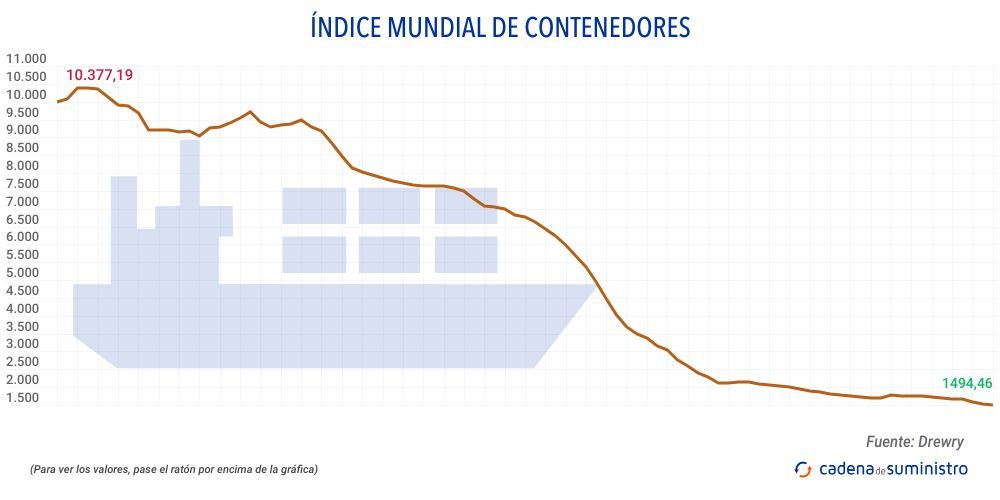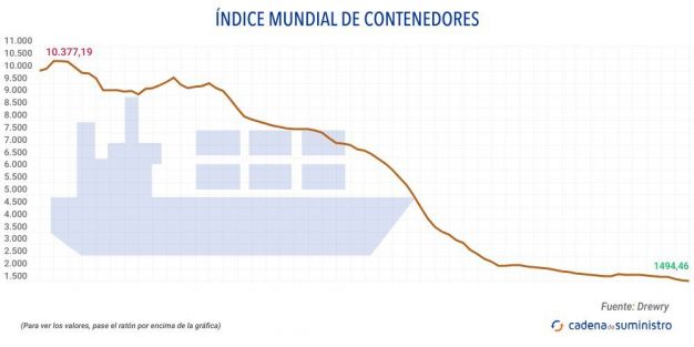 El Índice Mundial de Contenedores elaborado por Drewry, que evalúa las tasas de carga de contenedores en las ocho rutas principales hacia y desde Estados Unidos, Europa y Asia, se ha reducido en un 2,7% hasta los 1.494,46 dólares/FEU (1.378,33 euros).