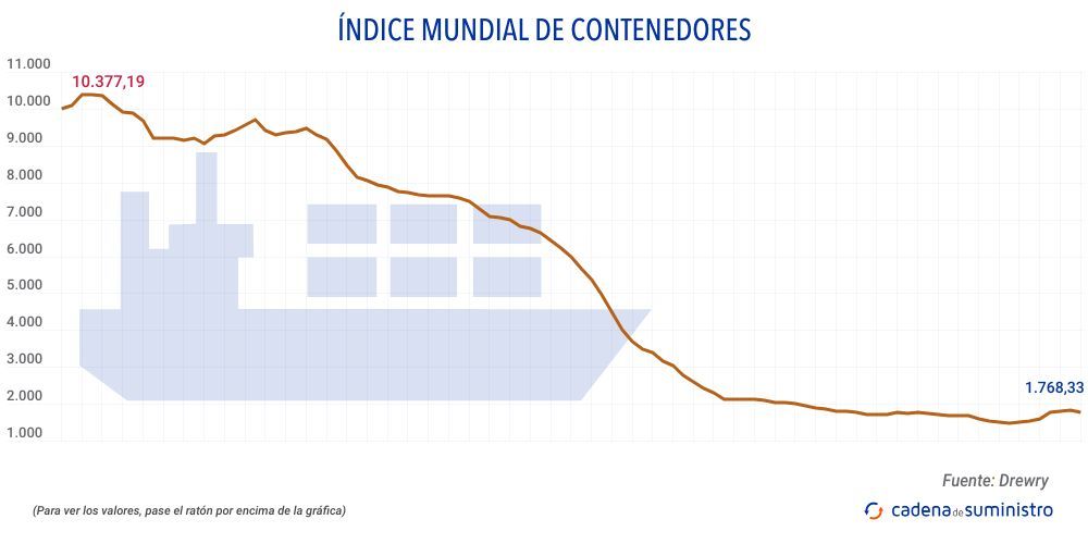 El Índice Mundial de Contenedores elaborado por Drewry, que evalúa las tasas de carga de contenedores en las ocho rutas principales hacia y desde Estados Unidos, Europa y Asia, se ha reducido en un 3,5% hasta los 1.768,33 dólares/FEU (1.641,28 euros).