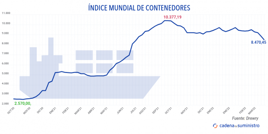 El Índice Mundial de Contenedores elaborado por Drewry, que evalúa las tasas de carga de contenedores en las ocho rutas principales hacia y desde Estados Unidos, Europa y Asia, se ha reducido un 4,1% en la última semana de marzo, con 8.470,45 dólares/FEU (7.694,81 euros).