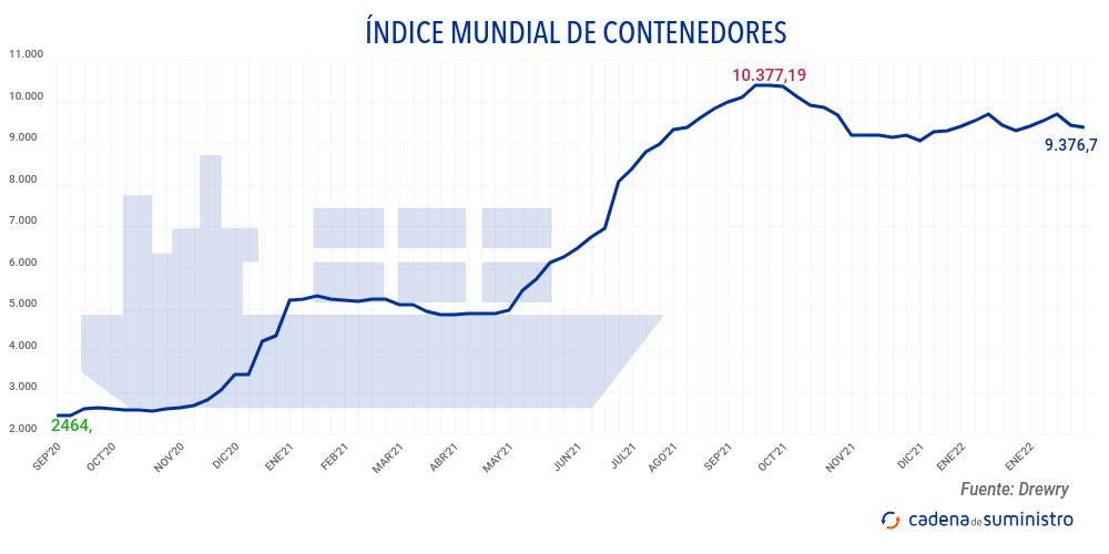 El Índice Mundial de Contenedores elaborado por Drewry, que evalúa las tasas de carga de contenedores en las ocho rutas principales hacia y desde Estados Unidos, Europa y Asia, se ha reducido en un 0,5% en la primera semana de febrero, con 9.376.70 dólares/FEU (8.185,86 euros).