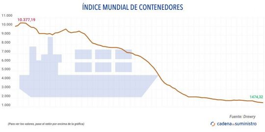 El Índice Mundial de Contenedores elaborado por Drewry, que evalúa las tasas de carga de contenedores en las ocho rutas principales hacia y desde Estados Unidos, Europa y Asia, se ha reducido en un 1,3% hasta los 1.474,32 dólares/FEU (1.354,16 euros).