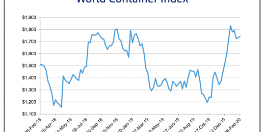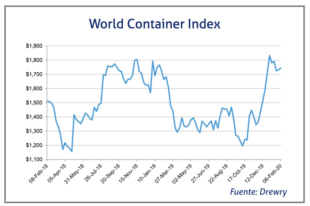 El Índice Mundial de Contenedores elaborado por la consultora Drewry, que evalúa las tasas de carga de contenedores en las ocho rutas principales hacia y desde Estados Unidos, Europa y Asia, se ha incrementado un 0,6% en la primera semana de febrero de 2020, situándose en los 1.743,52 dólares/FEU (1.585 euros).