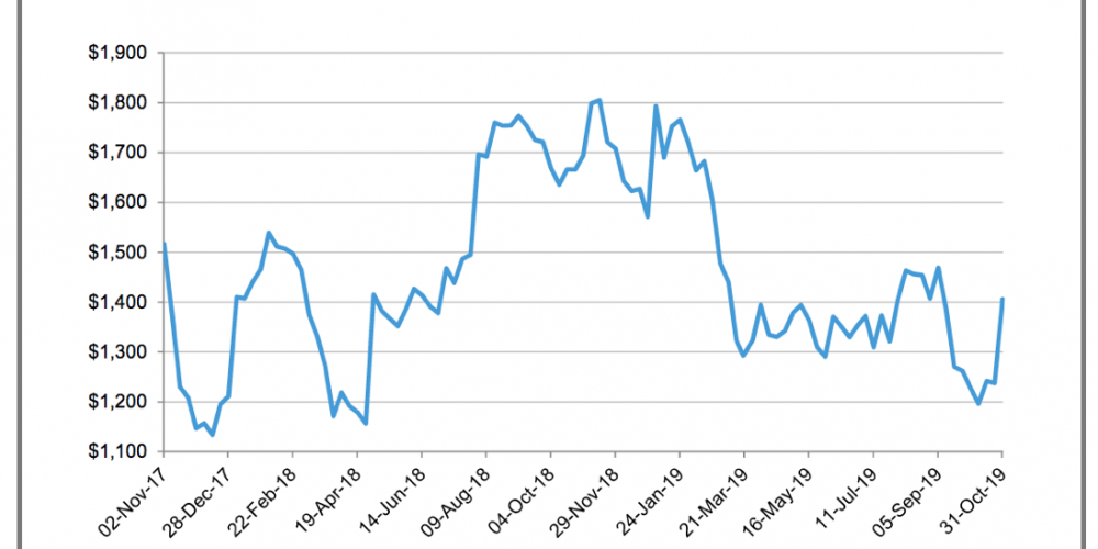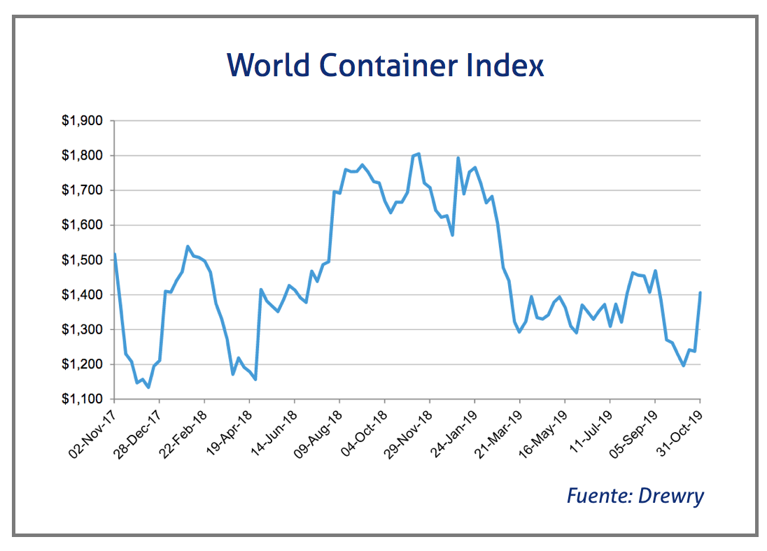 El Índice Mundial de Contenedores elaborado por la consultora Drewry, que evalúa las tasas de carga de contenedores en las ocho rutas principales hacia y desde Estados Unidos, Europa y Asia, ha crecido un 13,6% en la última semana de octubre de 2019, situándose en los 1.405,92 dólares/FEU (1.261 euros).