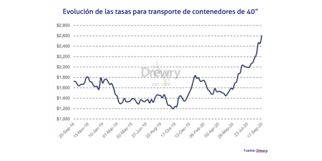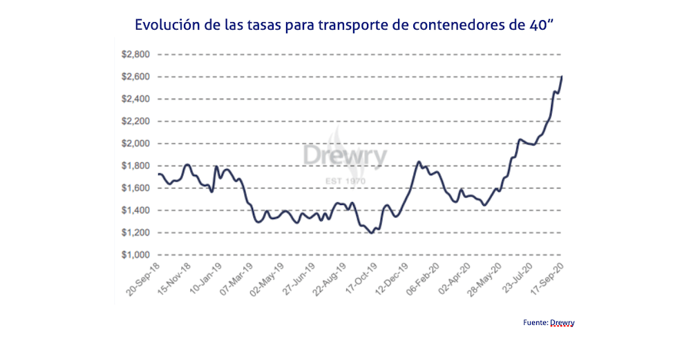 El Índice Mundial de Contenedores elaborado por la consultora Drewry, que evalúa las tasas de carga de contenedores en las ocho rutas principales hacia y desde Estados Unidos, Europa y Asia, ha crecido un 6,1% en la tercera semana de septiembre, llegando hasta los 2.603,7 dólares (2.207,55 euros).