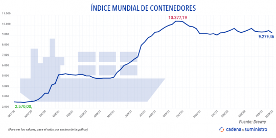 El Índice Mundial de Contenedores elaborado por Drewry, que evalúa las tasas de carga de contenedores en las ocho rutas principales hacia y desde Estados Unidos, Europa y Asia, se ha reducido en un 2,1% en la primera semana de marzo, con 9.279,46 dólares/FEU (8.430,85 euros).