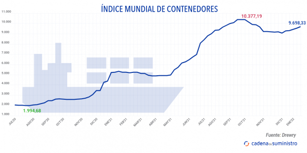 El Índice Mundial de Contenedores elaborado por Drewry, que evalúa las tasas de carga de contenedores en las ocho rutas principales hacia y desde Estados Unidos, Europa y Asia, se ha incrementado en un 1,6% en la tercera semana de enero, con 9.698,33 dólares/FEU (8.551,07 euros).
