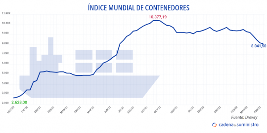El Índice Mundial de Contenedores elaborado por Drewry, que evalúa las tasas de carga de contenedores en las ocho rutas principales hacia y desde Estados Unidos, Europa y Asia, se ha reducido un 1,4% en la primera semana de abril, con 8.041,50 dólares/FEU (7.401,96 euros).