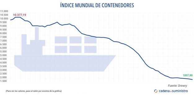 El Índice Mundial de Contenedores elaborado por Drewry, que evalúa las tasas de carga de contenedores en las ocho rutas principales hacia y desde Estados Unidos, Europa y Asia, se ha reducido en un 3% en la última semana, con 1.897,88 dólares/FEU (1. 797 euros).